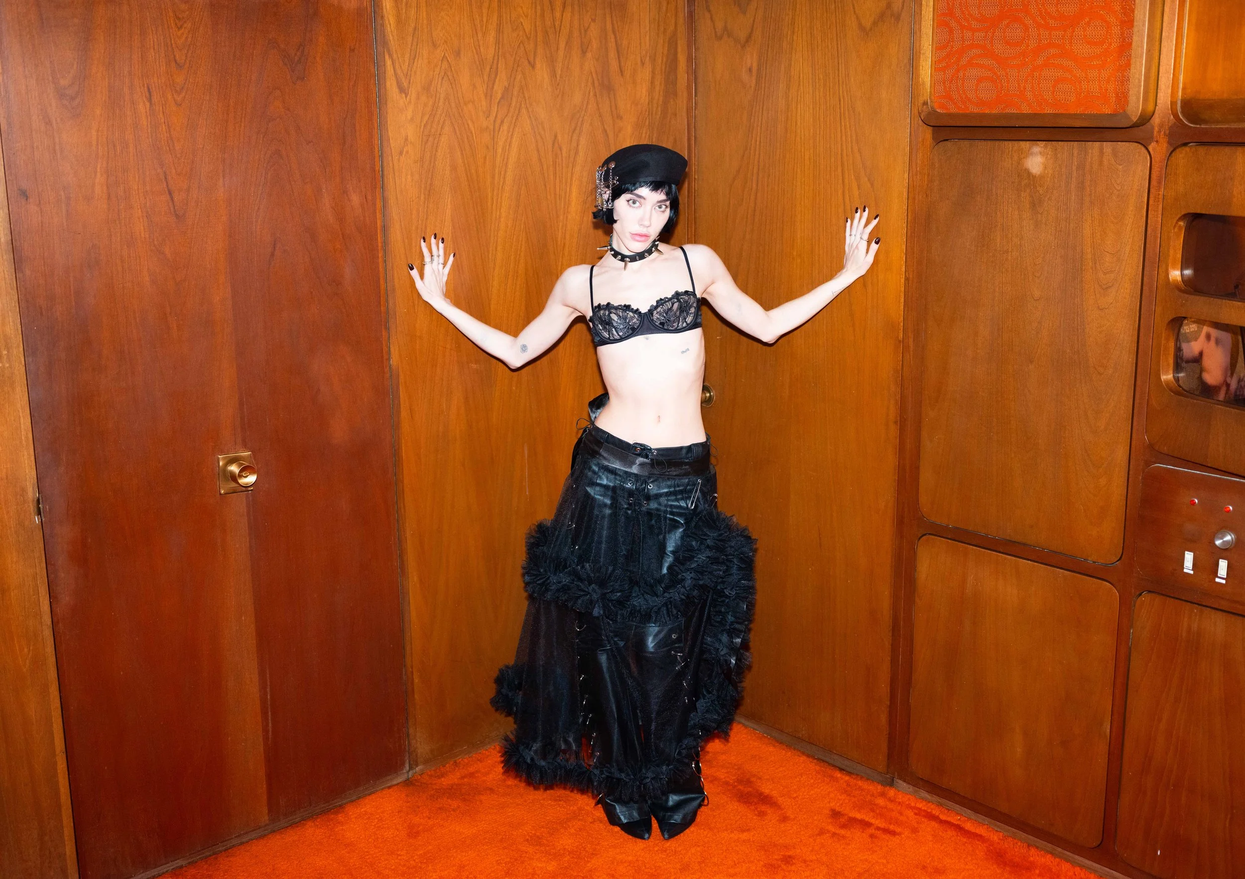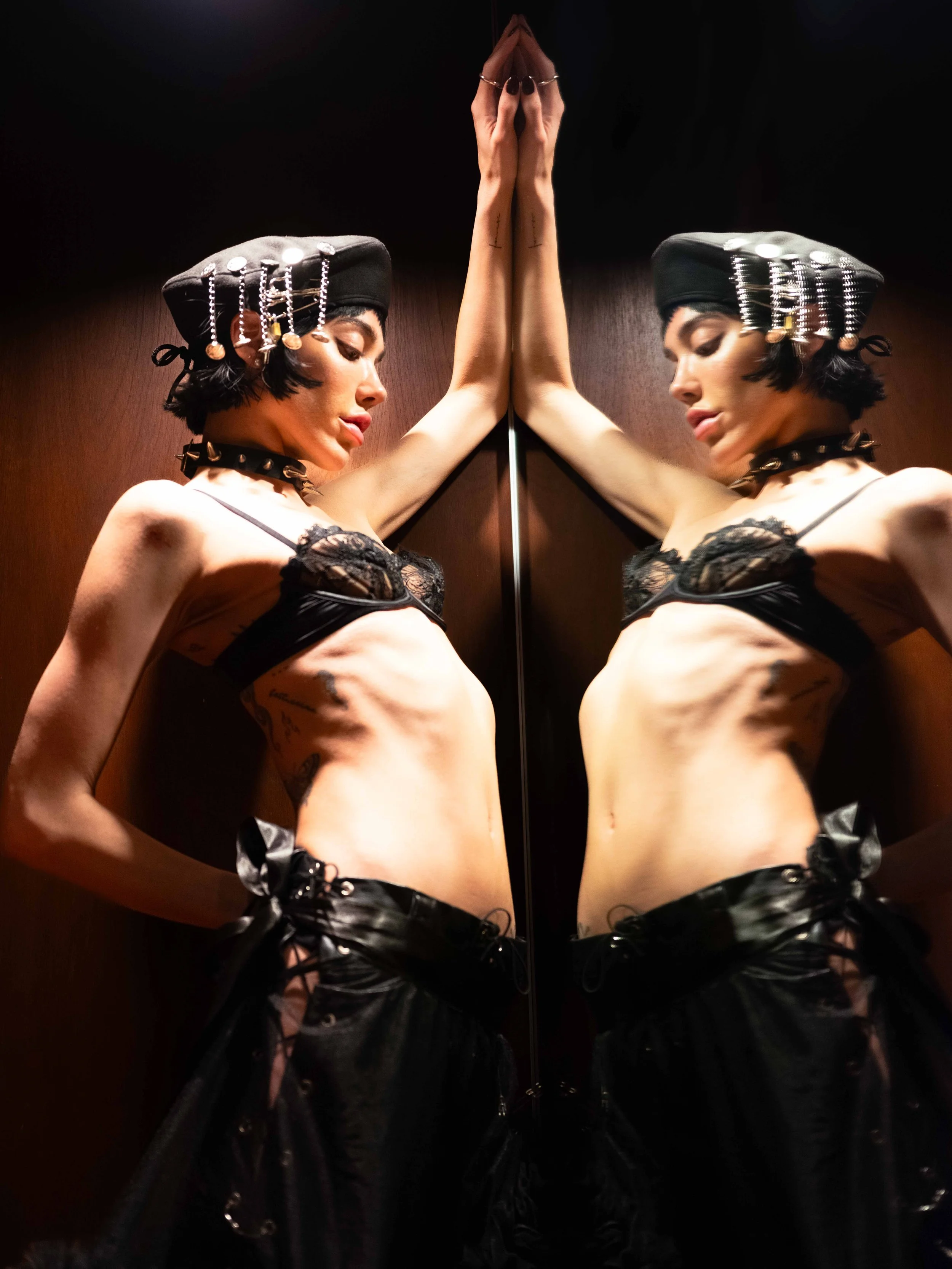 Dialing through disconnection and desire, this series captures a suspended intimacy — moments trapped between fantasy and reality. Shot within the textured, timeworn home in CDMX, the images explore the tension between agency and vulnerability. The telephone, an object meant to bridge distance, becomes a symbol of fractured communication and misinterpretation. The styling — sharp berets, leather cuffs, and fragmented lace — evokes a rebellious yet nostalgic femininity. Each pose, caught between languid and assertive, mirrors the uncertainty of waiting: for a call, for connection, for clarity. By leaning into the surreal, this work asks how much of our intimacy is manufactured, and how much of it is lost to crossed lines.